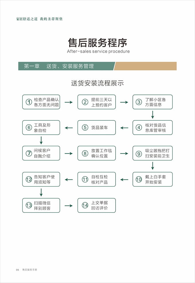 话术参考:“**先生/女士您好,我是圣蒂斯堡的售后服务人员**,您购买的圣蒂斯堡家具已经全部到货了,送货安装大约需要**时间,请问您这边什么时候方便我们上门送货安装呢?”同时要了解送货小区的电梯、楼道、入户门的尺寸等,提前做好准备,避免意外情况。最后确定送货时间(安装所需要时长),并告知客户安装人员的相关信息,可加微信发送,并发送配送安装流程说明。